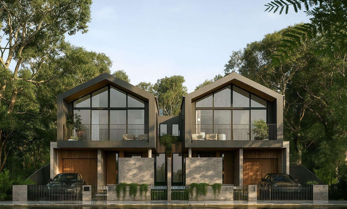 The design presents a contemporary dual-occupancy dwelling that harmoniously balances robust materiality with refined modern detailing. The composition embraces a symmetrical form, expressed through a central vertical division that defines two distinct yet cohesive residences. The use of red brick anchors the building to its suburban context, referencing traditional residential materials while its dark metal cladding and expansive glazing introduce a modern, sophisticated edge.