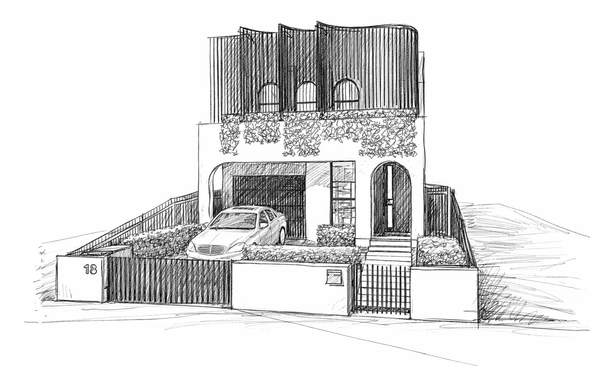 At the street, a sculptural aluminium screen forms a protective outer layer, softening the mass of the upper level while filtering light and views. Curved edges and arched openings introduce rhythm and tactility, lending the façade a sense of crafted precision rather than overt expression. Integrated planting is used as an architectural element, mediating between built form and landscape while reinforcing privacy and permanence.