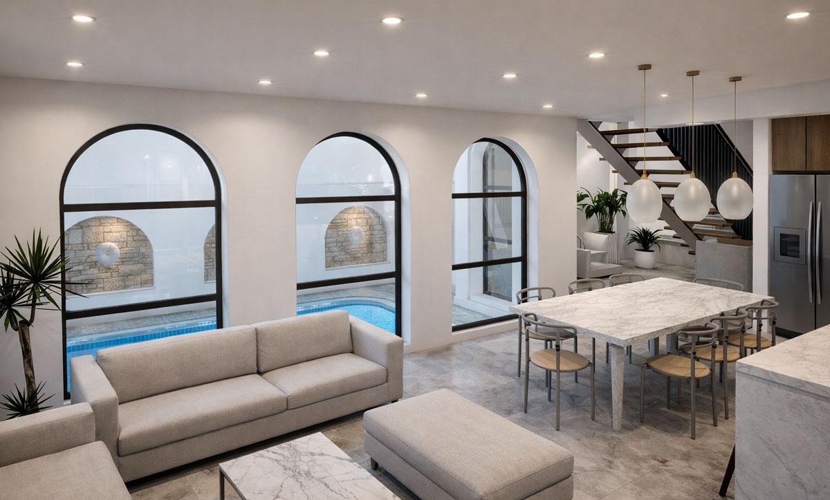 Internally, the language of the exterior is carried through with restraint and clarity. Arched openings, natural stone, and finely detailed joinery create a cohesive spatial sequence grounded in proportion and material honesty. Light is carefully modulated throughout the day, animating surfaces and reinforcing the sense of calm. Circulation and living spaces flow intuitively, supporting both everyday living and quiet moments of retreat.